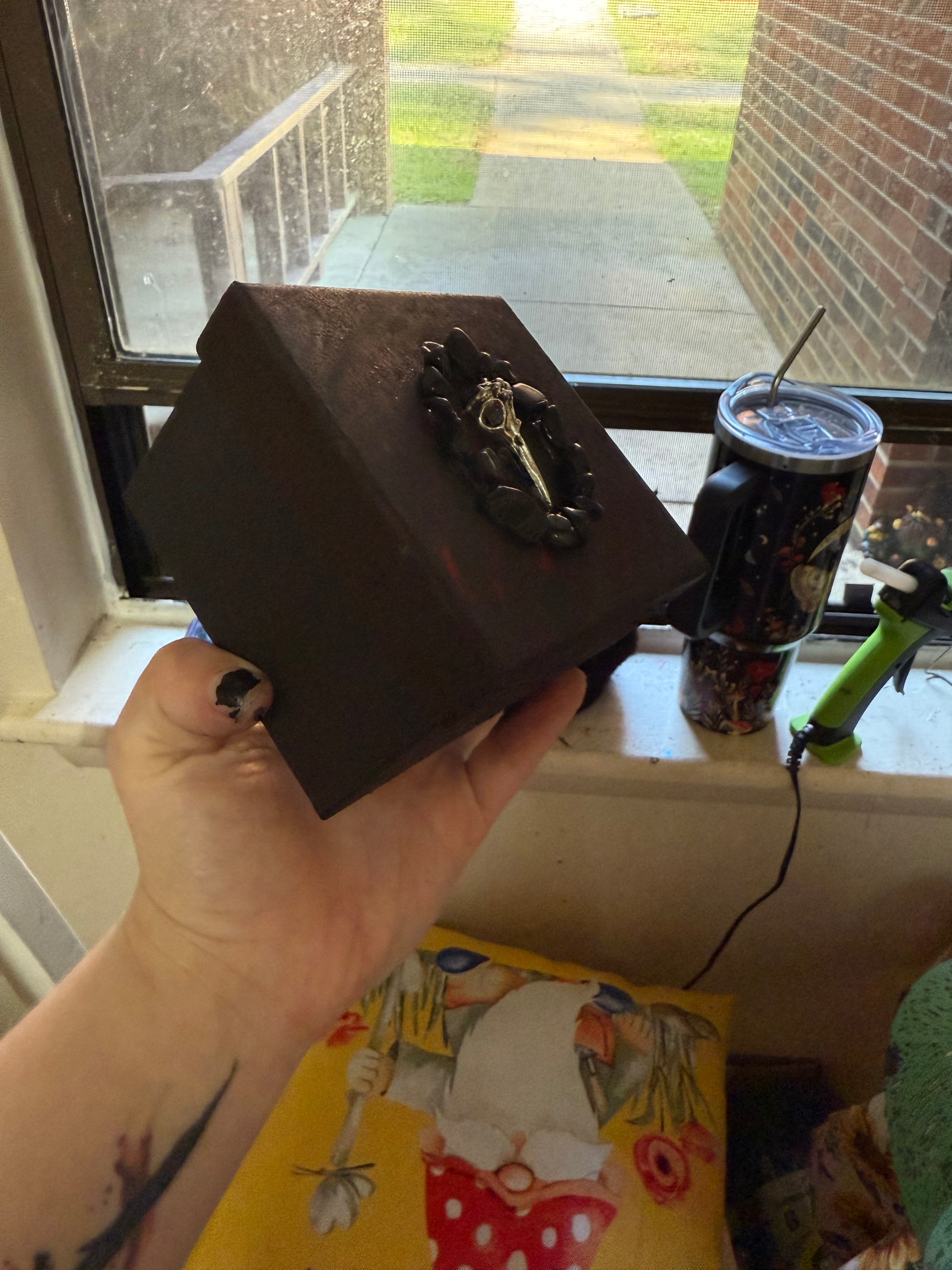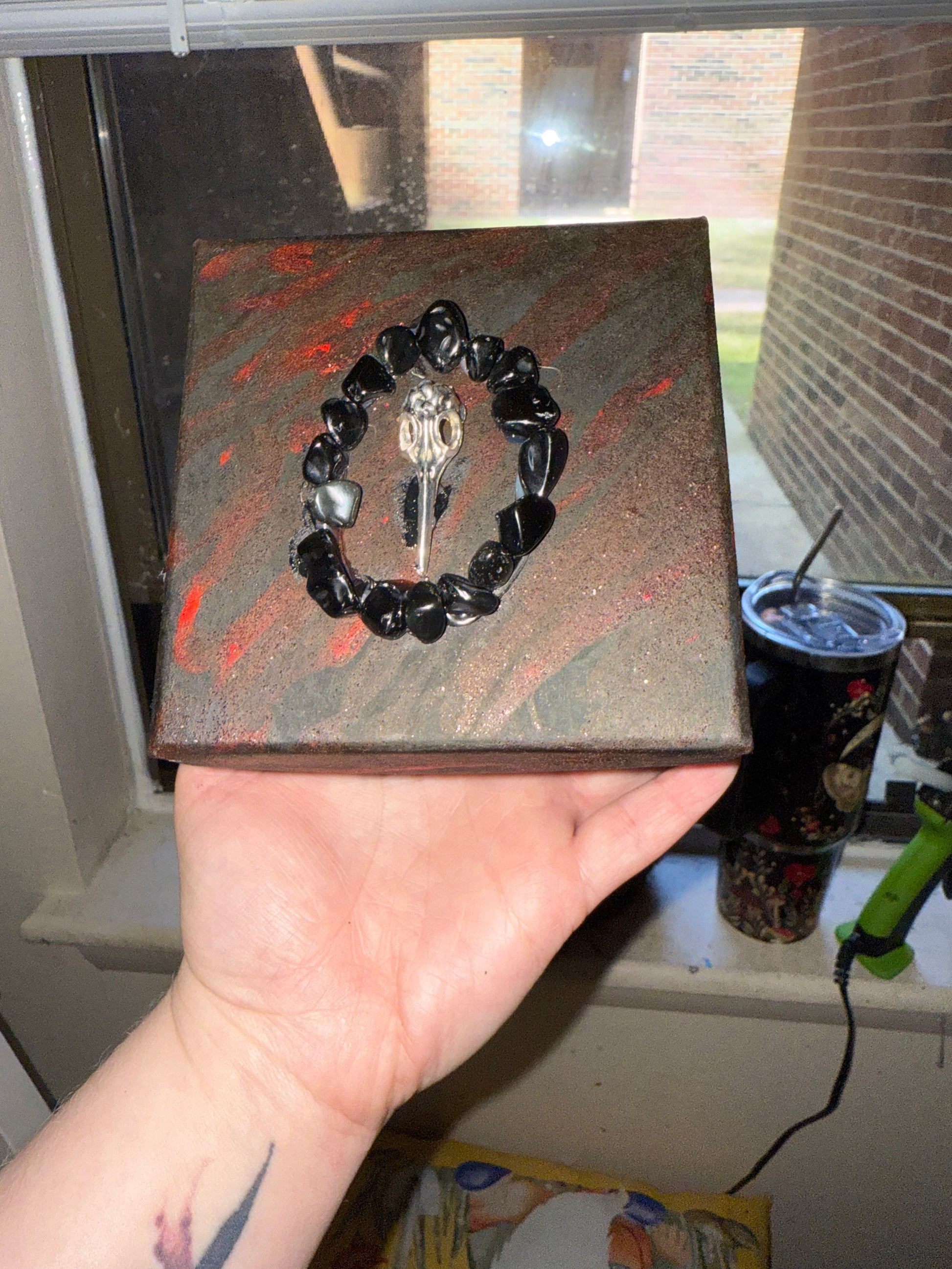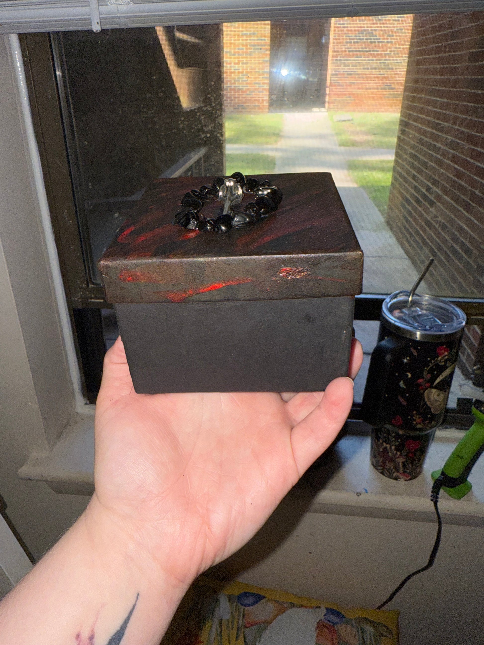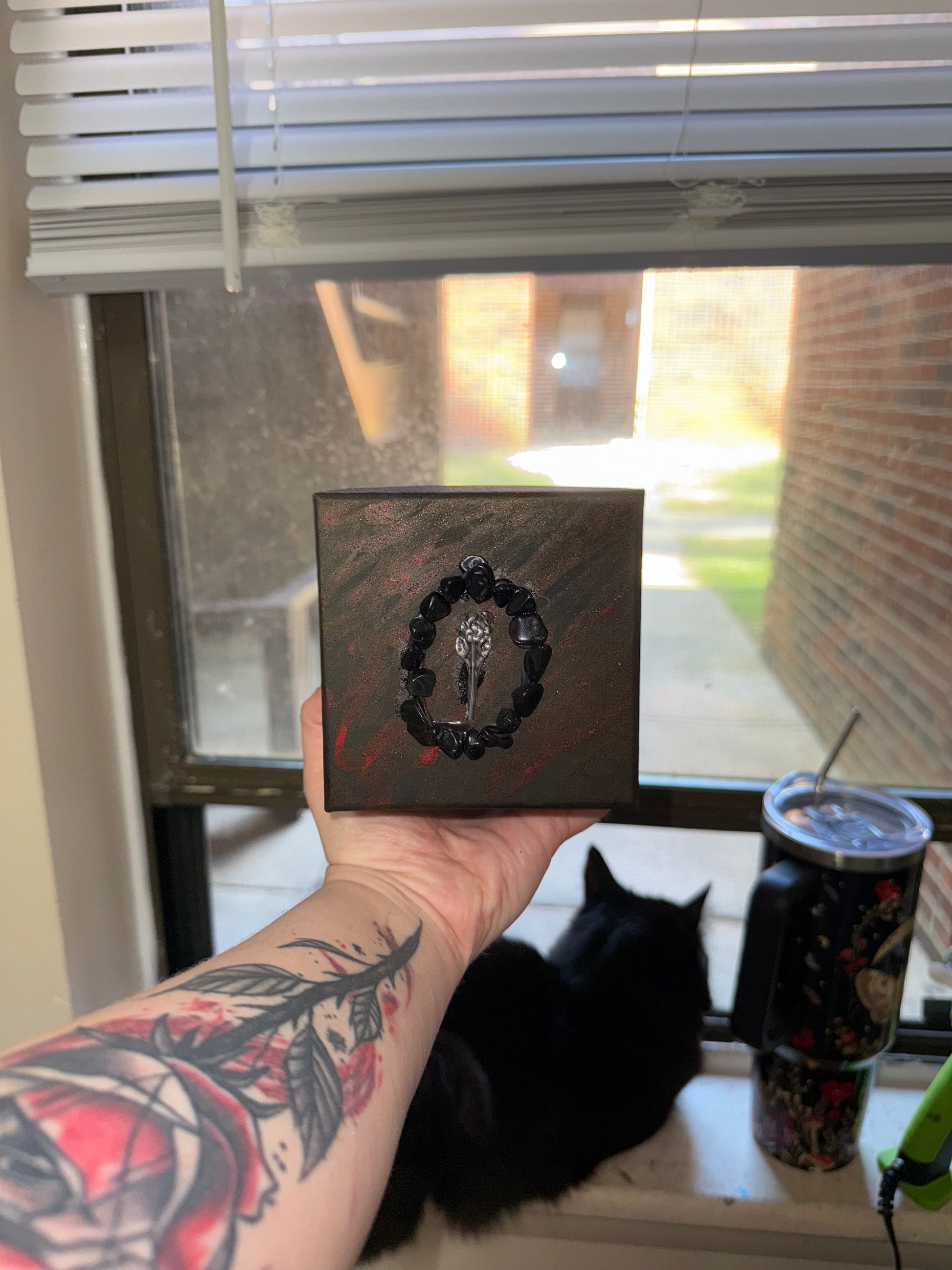 Get organized with this stylish black and red trinket box, perfect for storing your favorite jewelry pieces. This playful piece adds a pop of color to any room and makes a great gift.