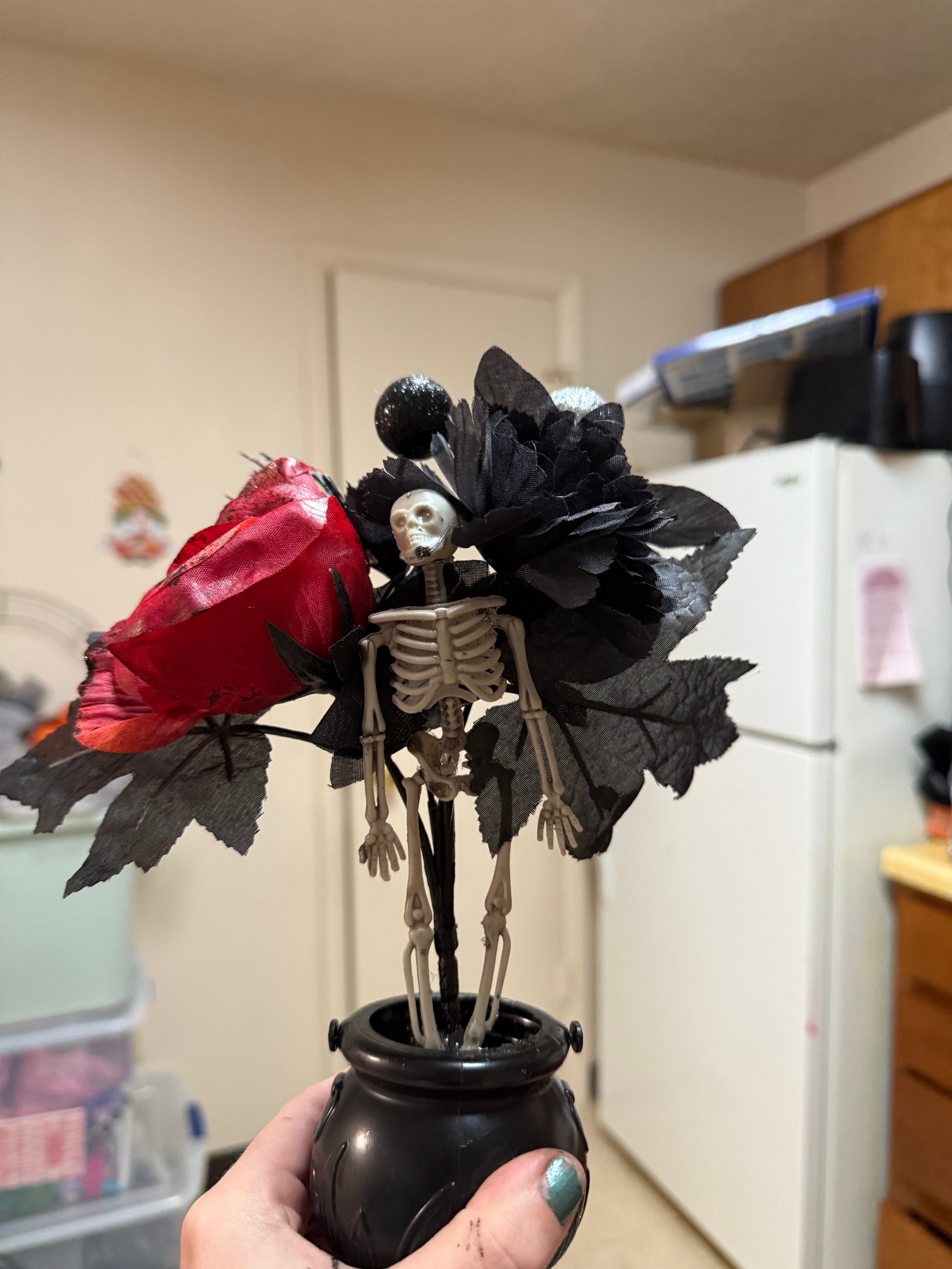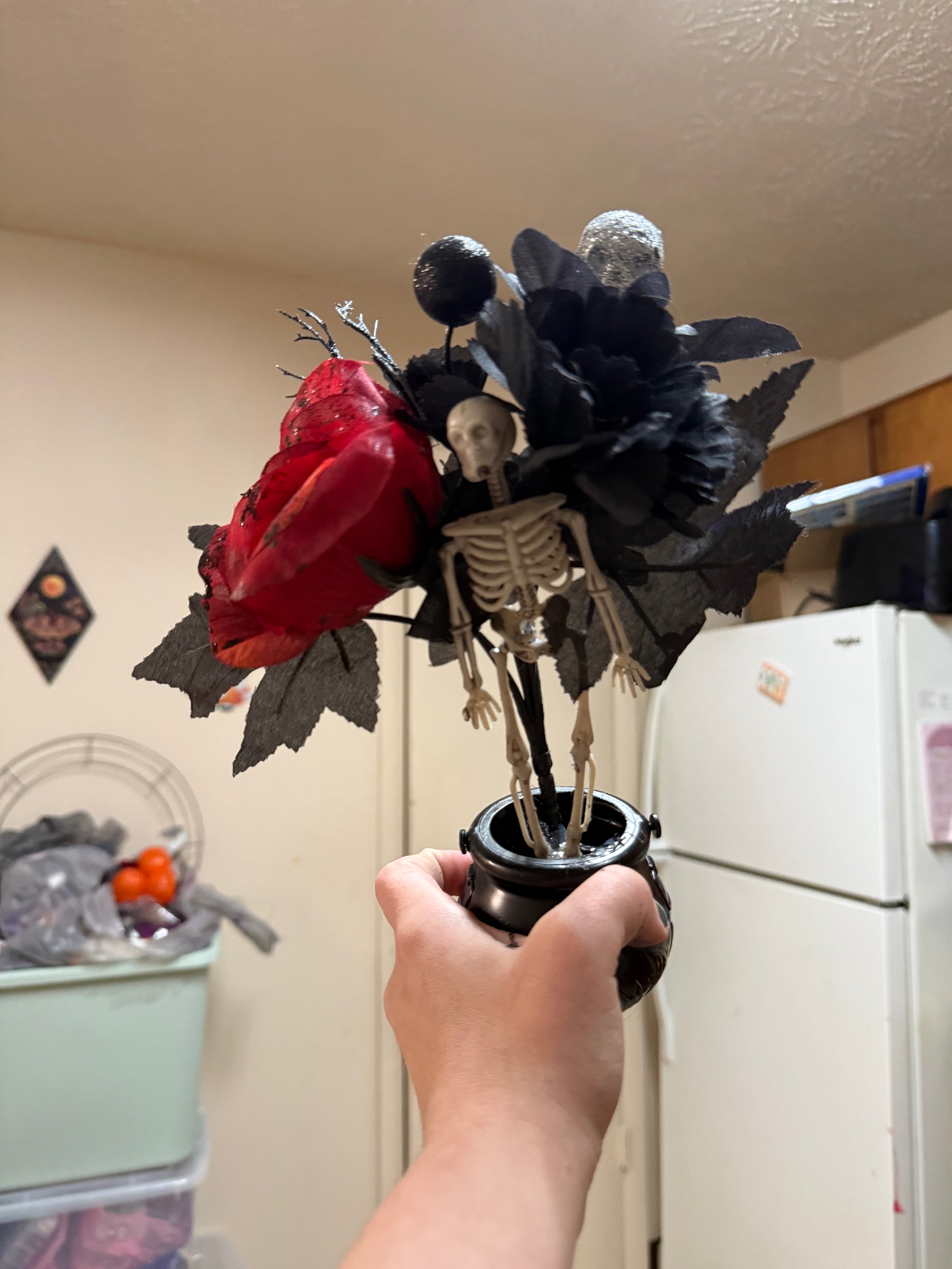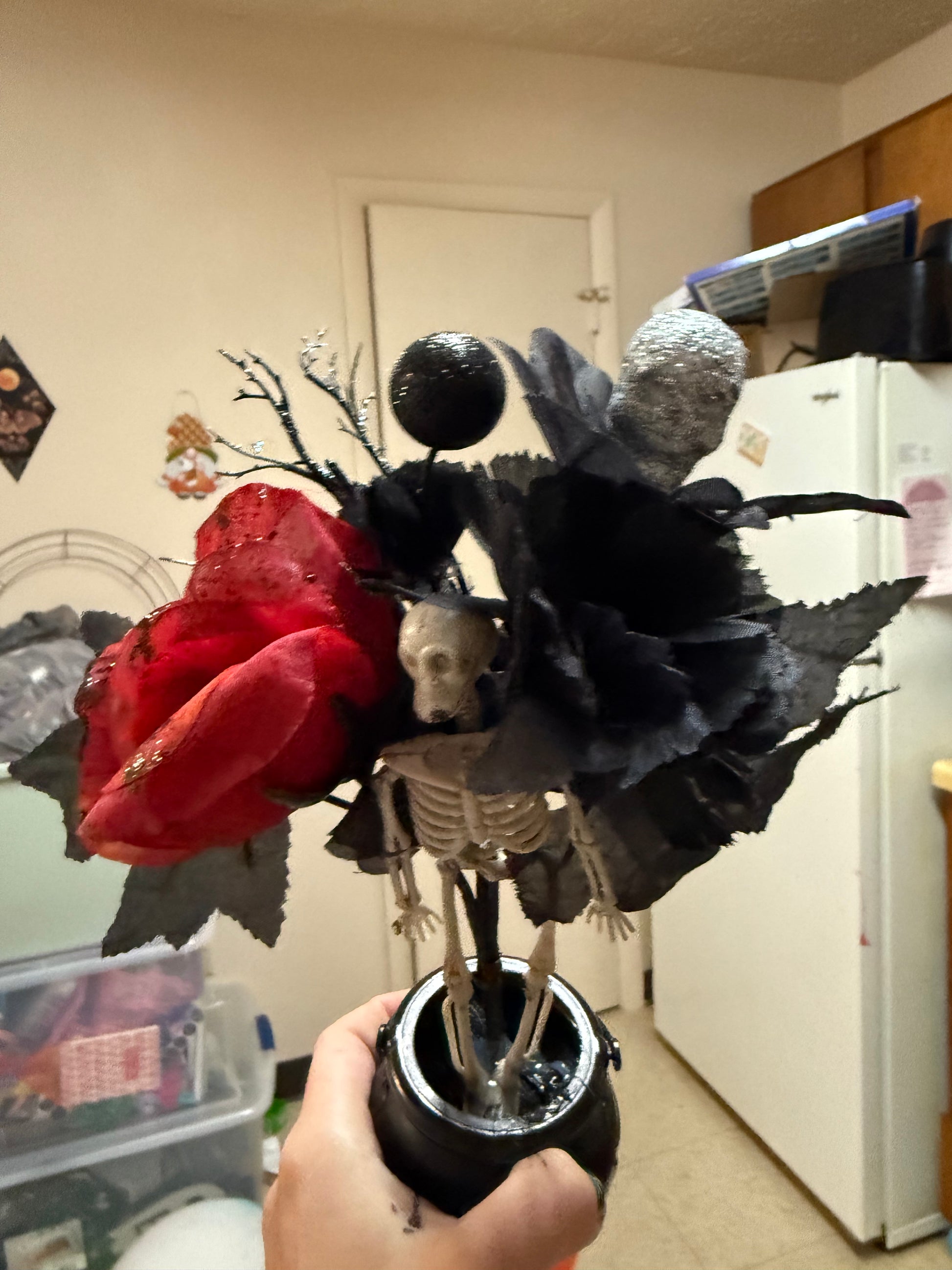 Add some spooky romance to your home with our Skeleton & roses 🥀 arrangement. This unique piece combines a playful skeleton and elegant roses for a one-of-a-kind design that will surely catch everyone's eye. Perfect for Halloween or year-round decor.